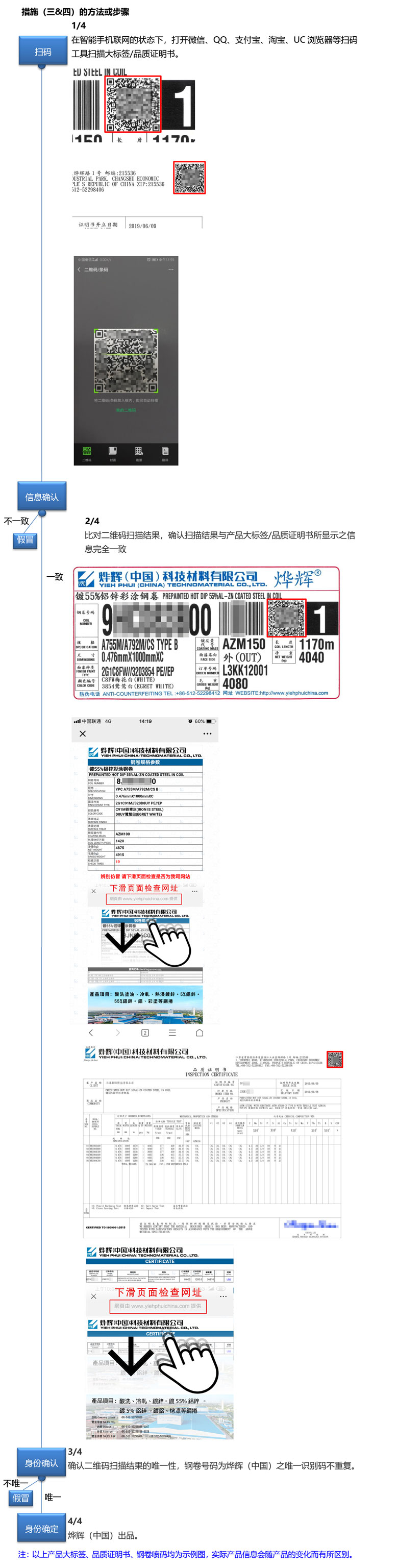 YPC镀烤产品在出货同时会附带有每颗钢卷的质量保证书,客户可对比质量保证书与钢卷标签信息查验真伪。客户还可通过扫描品质证明书上二维码查询钢卷信息。