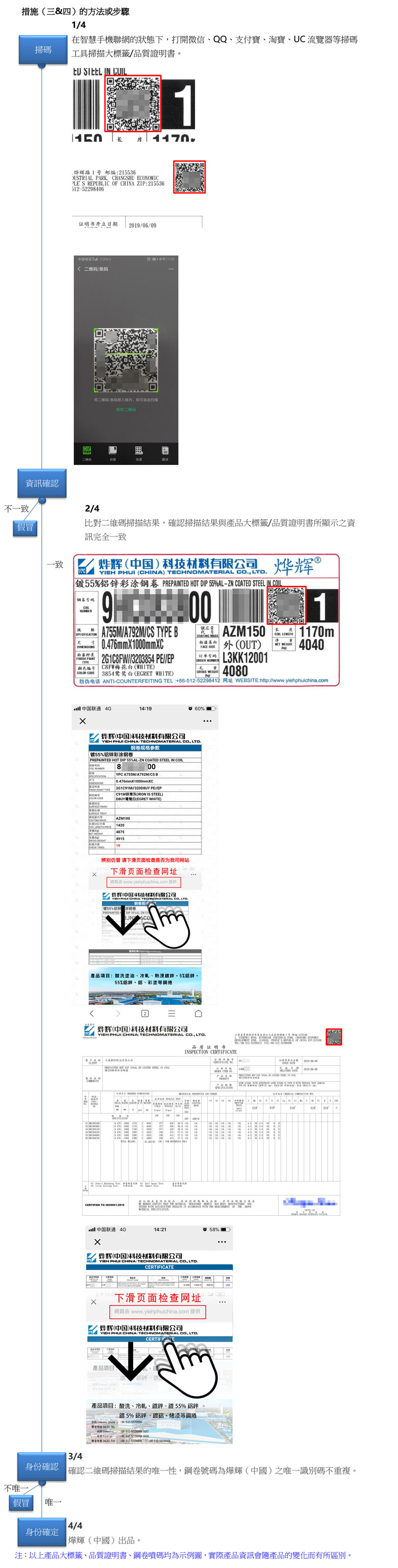 YPC鍍烤產品在出貨同時會附帶有每顆鋼卷的品質保證書,客戶可對比品質保證書與鋼卷標籤資訊查驗真偽。客戶還可通過掃描品質證明書上二維碼查詢鋼卷資訊。