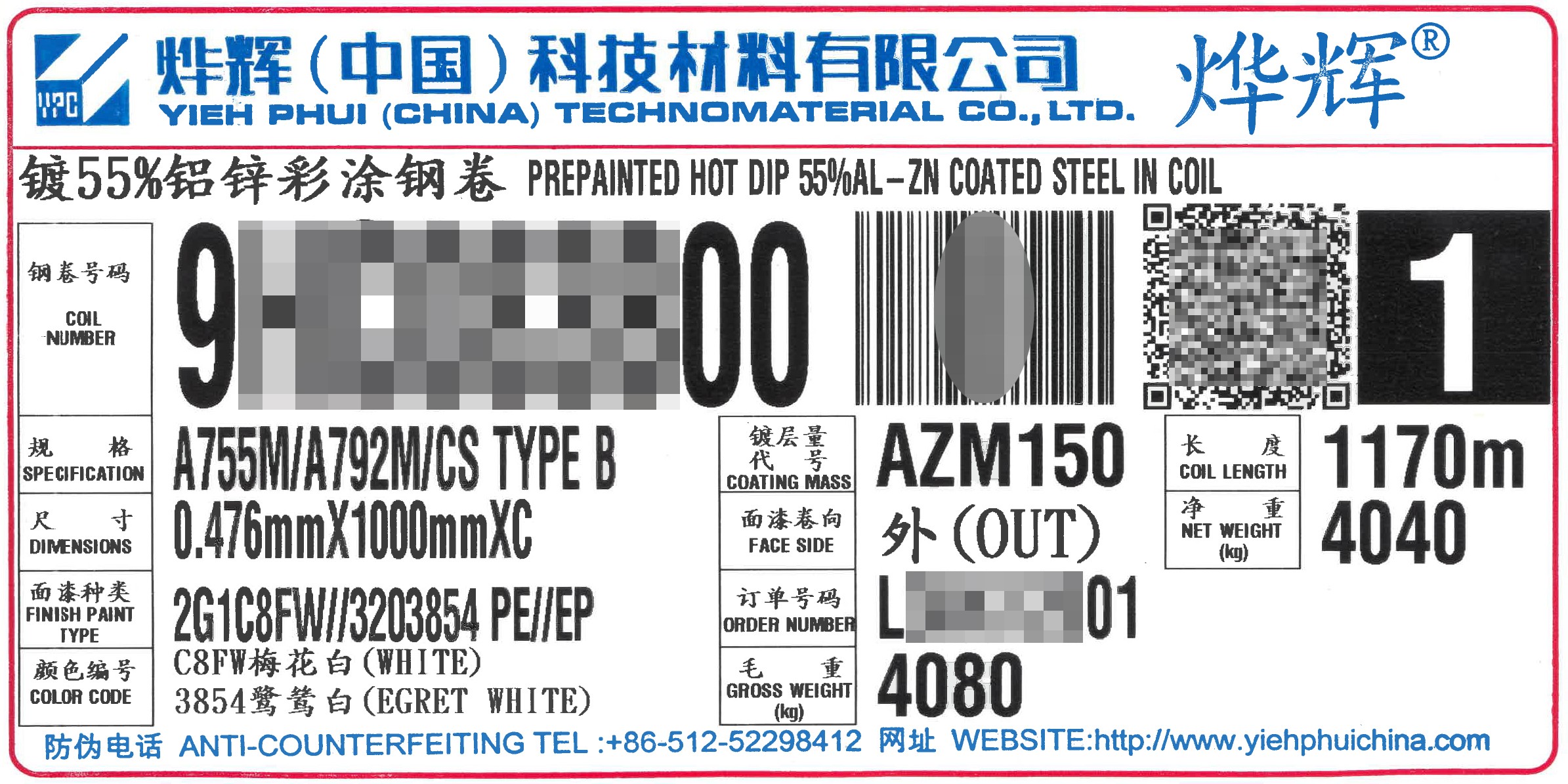 YPC鍍烤產品包裝內外均有鋼卷身份標籤,除表示鋼卷號碼,規格,尺寸,表面處理(油漆組合),重量等資訊外, 客戶還可通過掃描標籤上二維碼查詢鋼卷資訊。