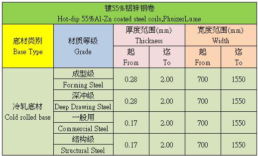 注:鍍55%鋁鋅產品可生產鍍層量範圍:70~225g/m2
