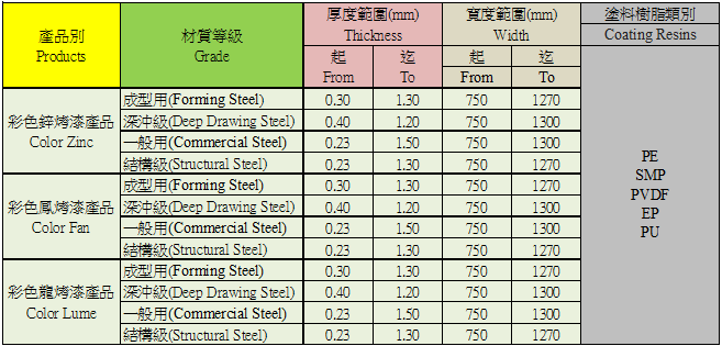 注:彩色鋅烤漆產品可生產鍍層量範圍:80~600g/m2